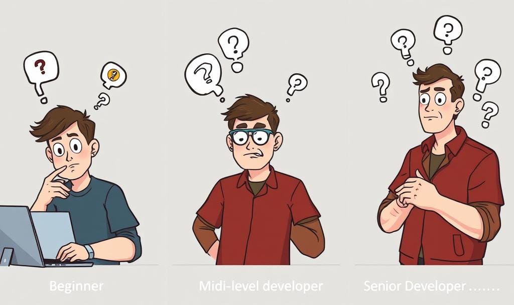 <An image of a progression: a beginner developer looking confused at basic code, then a mid-level developer tackling more complex code with some confidence, and finally a senior developer comfortably navigating very complex systems while still having some question marks – illustrating that confusion never disappears, just gets managed better